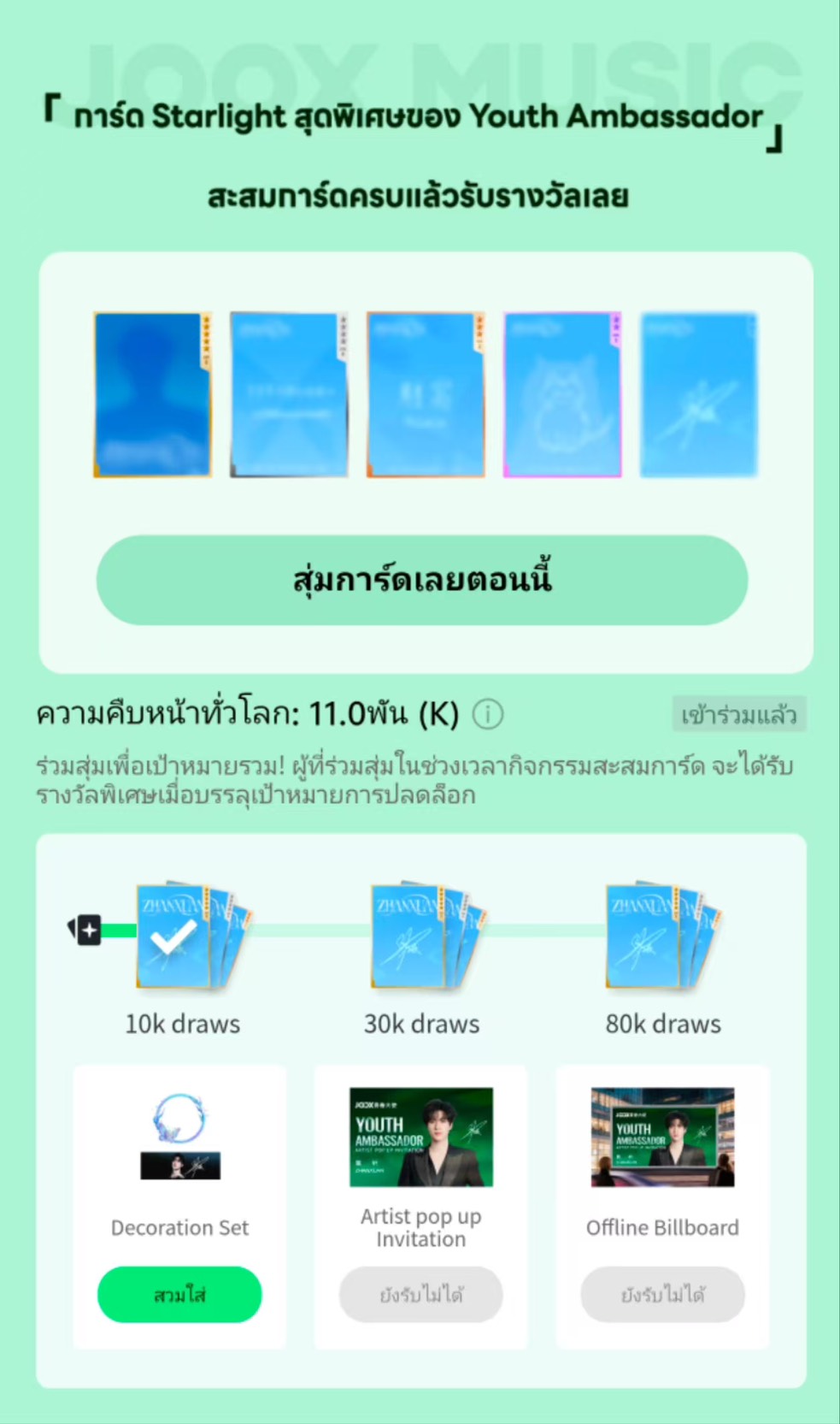 สำหรับการร่วมมือครั้งนี้ ได้เปิดตัวสิทธิพิเศษสุดเอ็กซ์คลูซีฟมากมาย เพื่อแสดงความยินดีกับ JOOX Youth Ambassador อย่างเป็นทางการ เพื่อตอบสนองความรักของทั้งแฟนคลับและผู้ใช้งานทั่วไปทุกคน โดยการ์ดสะสม Zhan Xuan · JOOX Youth Ambassador · Starlight Card คือหัวใจของความร่วมมือครั้งนี้ การ์ดสะสม Starlight คือการ์ดดิจิทัลที่สามารถสะสมผ่านแอปพลิเคชัน JOOX ด้วยระบบสุ่มการ์ด หน้าการ์ดแต่ละใบเป็นภาพศิลปินที่คุณรัก มาพร้อมกับความพิเศษแตกต่างกันไปตามระดับดาวของการ์ดที่ได้รับ เมื่อสะสมครบแล้ว ยังสามารถนำการ์ดดิจิทัลไปแลกเป็นการ์ดจริงเพื่อเก็บสะสมหรือพกติดตัวไปได้ทุกที่ และภายในคลังการ์ดครั้งนี้มาพร้อมคอนเทนต์สุดพิเศษที่บันทึกทั้งเสียงและความรู้สึกของศิลปินไว้อย่างครบถ้วน ทั้งคลิปเสียง ข้อความลายมือ และลายเซ็นดิจิทัลจาก Zhan Xuan การ์ดจริงระดับ 5 ดาวออกแบบด้วยเทคโนโลยีกราฟิก Lenticular พร้อมหมายเลขซีเรียลเฉพาะตัวในแต่ละใบ ทำให้ทรงคุณค่าในการสะสมเป็นอย่างยิ่ง นอกจากนี้ การสะสมการ์ดยังเปิดโอกาสให้ปลดล็อกรางวัลพิเศษเพิ่มเติม ได้แก่ ธีมแอปฯ เฉพาะของ Youth Ambassador คอมเมนต์เซอร์ไพรส์จากศิลปิน และการปรากฏตัวบนจอ LED ในต่างประเทศ