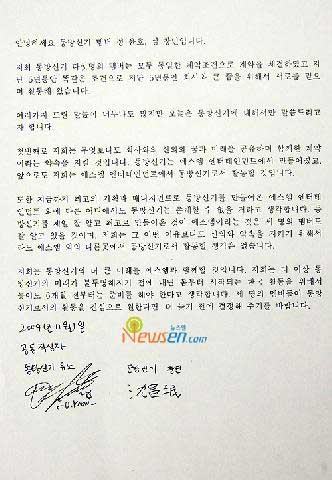 .....เราสมาชิกวงดงบังชินกิทั้ง 5 คน ได้เซ็นสัญญาเหมือนกันด้วยเหตุผลเดียวกันเป็นเวลา 5 ปีมาแล้ว และได้ทำงานร่วมกันภายใต้เงื่อนไขที่ต้องเชื่อใจบริษัทอย่างสูงสุดเพื่อทำความฝันของแต่ละคนและความฝันของพวกเรา เราตั้งใจที่จะ แบ่งปันฝันและอนาคตร่วมกับบริษัทและรักษาสัญญาซึ่งได้ร่วมกันในข้อตกลงนั้น ดงบังชินกิถูกสร้างโดย SME และเรามุ่งมั่นที่จทำงานในนาม ดงบังชินกิ กับ SME ในจดหมายระบุ