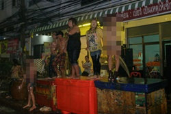 เมื่อมีสาวประเภทสอง ประมาณ 5-6 คน ดื่มเหล้าเมาได้ที่ ก็สวมบท โคโยตี้ ปีนขึ้นไปบนถังน้ำแข็ง โยกย้ายส่ายเอวเด้งหน้าเด้งหลัง และเมื่อถูกเสียงเชียร์ให้ถอด ก็ทำเอาสาวประเภทสอง ที่อยากโชว์เรือนร่าง ก็ถอดกางเกงขาสั้น สวมชุดชั้นในจีสตริง ขึ้นโยกย้ายส่ายสะโพก ท่ามกลางหนุ่มๆ ที่เดินเข้าไปหอมแก้ม ป้ายแป้ง และล้วงควักกัน สาวประเภทสองกลุ่มดังกล่าวก็ยังถอดเสื้อชั้นในโชว์อีก ซึ่งนักท่องเที่ยวและหลายคนที่มาร่วมเล่นน้ำสงกรานต์ และเด็กเยาวชนอยู่ด้วยที่เห็นแล้ว ทนไม่ได้ ต่างตะโกนด่าทอ "อุบาทว์" เป็นการทำลายประเพณีสงกรานต์ที่ดีงาม นอกจากนี้ ยังมีกะเทยบางกลุ่มถอดเสื้อผ้า โชว์นม ถอดกางเกงโชว์อวัยวะเพศที่ผ่าตัดแล้ว ให้กับชายหนุ่มที่มาเล่นสงกรานต์ จับลูบคลำได้ด้วย