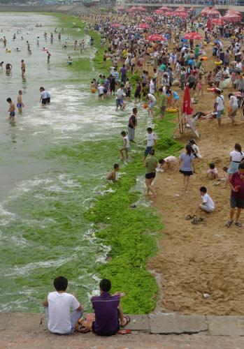 สาหร่ายทะเล ลอยเกลื่อนเต็มชายหาดจีนชายหาดเมืองชิงเต่า ของประเทศจีน กำลังถูกสาหร่ายทะเลขึ้นปกคลุมเต็มชายหาดยาวเกือบครึ่งกิโลเมตร อีกทั้งสาหร่ายยังได้ส่งกลิ่นเหม็นคลุ้งไปทั้งชายหาด