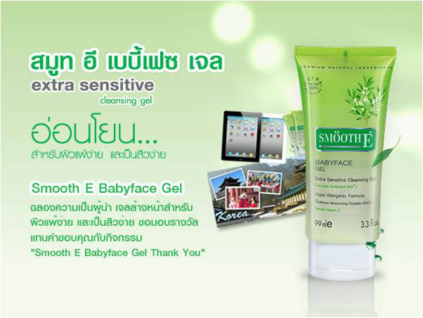 " Smooth E Babyface Gel ฉลองความเป็นผู้นำ เจลล้างหน้าสำหรับผิวแพ้ง่าย และเป็นสิวง่าย ขอมอบรางวัลแทนคำขอบคุณกับกิจกรรม "Smooth E Babyface Gel Thank You" ลุ้นรับง่ายๆเพียงซื้อผลิตภัณฑ์ Smooth E Babyface Gel ขนาดใดก็ได้ แล้วนำเลขที่ใบเสร็จมาลงทะเบียนที่ www.SmoothEBabyfaceGel.com ลุ้นเที่ยวเกาหลีฟรี หรือ รับ iPad 2 หรือ รับ Smooth E Babyface Gel ไปใช้เลย 1 ปี !! ร่วมลุ้นได้ตั้งแต่วันนี้ถึง 30 เมษายน 2555 ประกาศรางวัลทุกเดือน ยิ่งซื้อมากยิ่งมีสิทธิ์มากนะคะ "