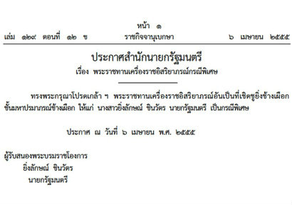 เว็บไซต์ ราชกิจจานุเบกษา เผยแพร่ประกาศ สำนักนายกรัฐมนตรี เรื่อง พระราชทานเครื่องราชอิสริยาภรณ์กรณีพิเศษ แก่ น.ส.ยิ่งลักษณ์ ชินวัตร นายกรัฐมนตรี ตามประกาศในราชกิจจานุเบกษา เล่ม 129 ตอนที่ 12 ข. วันที่ 6 เมษายน พ.ศ. 2555