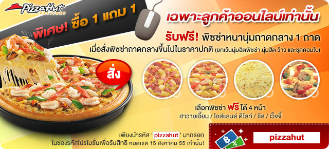 พิซซ่าฮัท รุกตลาดออนไลน์ ตอบรับนิวไลฟ์สไตล์คนรุ่นใหม่ ส่งโปรโมชั่นสุดคุ้มเฉพาะลูกค้าที่สั่งผ่าน Pizza Hut Online Ordering ซื้อ 1 ถาด แถมฟรี 1 ถาด เพียงนำรหัส pizzahut มากรอกในช่องรหัสโปรโมชั่นเพื่อรับสิทธิ