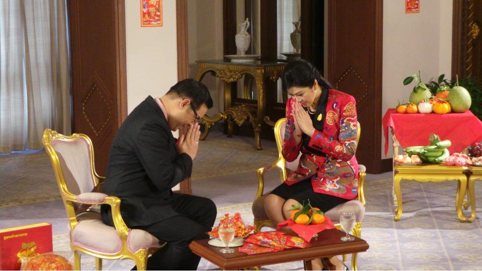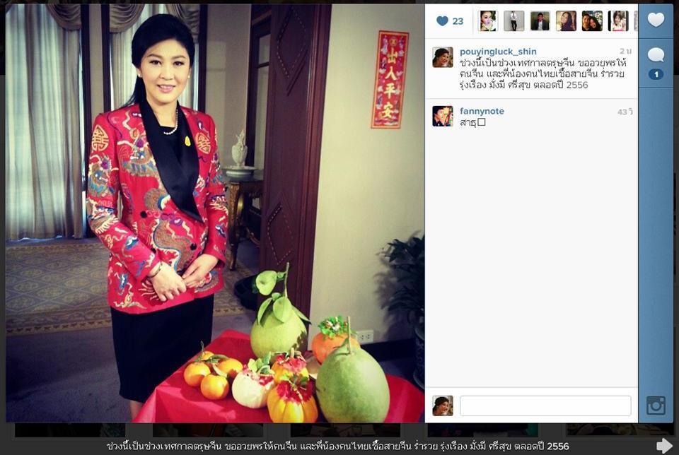โดยนายกรัฐมนตรียังได้ถือโอกาสนี้อวยพรประชาชนว่า "ช่วงนี้เป็นช่วงเทศกาลตรุษจีน ขออวยพรให้คนจีน และพี่น้องคนไทยเชื้อสายจีน ร่ำรวย รุ่งเรือง มั่งมี ศรีสุข ตลอดปี 2556" นอกจากนี้ ยังมีภาพชุดนายกฯยิ่งลักษณ์บันทึกเทปรายการรัฐบาลยิ่งลักษณ์พบประชาชน พร้อมถ่ายภาพกับผลไม้มงคลเนื่องในเทศกาลตรุษจีนอีกด้วย
