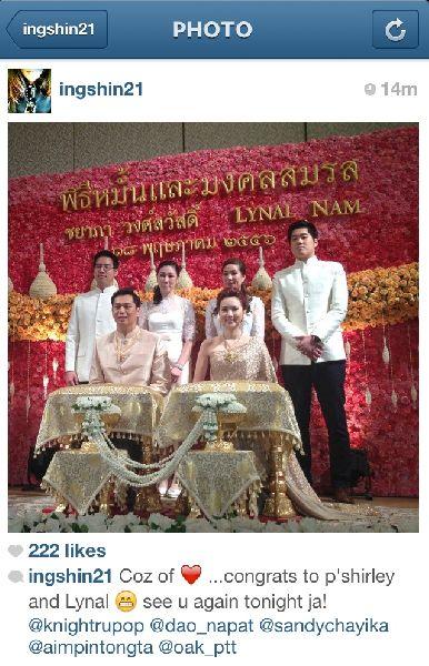 อย่างไรก็ตาม ผู้สื่อข่าวรายงานว่า ที่อินสตาแกรมของ น.ส.แพทองธาร ชินวัตร บุตรสาว พ.ต.ท.ทักษิณ ชินวัตร อดีตนายกรัฐมนตรี ได้มีการอัพโหลดรูปถ่าย คู่บ่าว-สาว ในพิธี แชร์ให้กับบรรดาผู้ติดตามด้วยร่วมแสดงความยินดีอีกด้วย