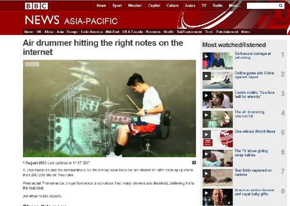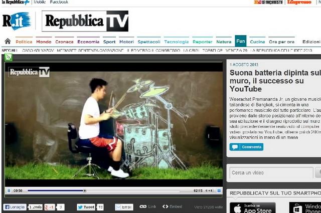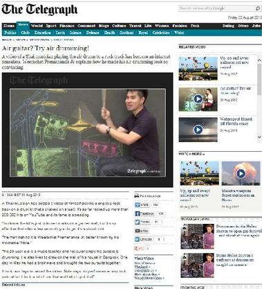 ผู้สื่อข่าวรายงานว่า ขณะนี้ สำนักข่าวต่างประเทศชื่อดังต่าง ๆ ระดับโลก ทั้ง บีบีซี เดอะเทเลกราฟ ของอังกฤษ รวมถึง Repubblica ของอิตาลี และของเยอรมัน ต่างนำเสนอความสามารถอันน่าทึ่งของ "นายวีรฉัตร เปรมานนท์" ศิลปิน-นักดนตรี ชาวไทย วัย 29 ปี กับ การตีกลองกลางอากาศกับภาพวาดสีชอล์คบนกำแพง
