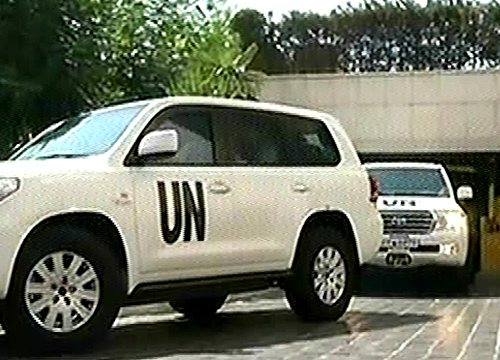มาร์ติน เนเซอร์กี โฆษกขององค์การสหประชาชาติ (ยูเอ็น) กล่าวว่า ทีมงานของผู้ตรวจสอบการใช้อาวุธเคมี ถูกโจมตี ด้วยกลุ่มพลแม่ปืน (สไนเปอร์) ไม่ทราบฝ่าย หลังจากขบวนรถผ่านเขตกันชน เพื่อเขามายังกรุงดามัสกัส ก่อนที่เจ้าหน้าที่จากด่านตรวจ จะช่วยยิงสกัดกั้น คุมกันขบวนรถให้เดินทางต่อไปได้อย่างปลอดภัย
