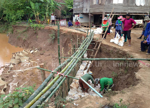 ผู้รับเหมาเร่งสร้างแนวป้องกันตลิ่งพังชั่วคราว ในขณะที่ชาวบ้านยังไม่มั่นใจว่าจะเอาอยู่