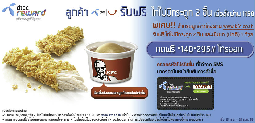 วันนี้สั่ง KFC ออนไลน์ด้วยโปรโมชั่นดี ๆ จาก Dtac ถึงวันที่ 31 ตุลาคม 56