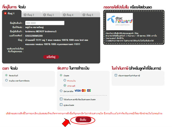 6. ตรวจสอบที่อยู่ เวลาในการจัดส่ง ช่องทางในการชำระเงินเรียบร้อย และกดยืนยันเป็นการจบขั้นตอนในการสั่งอาหาร