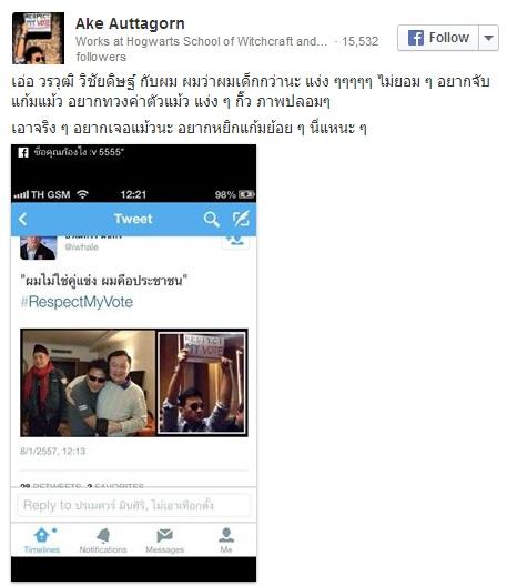 (8 ม.ค.) ผู้สื่อข่าวรายงานว่า ภายหลังจากศึกวิวาทะระหว่าง หนุ่มชูป้าย Respect My Vote หรือผู้ใช้เฟซบุ๊ก Ake Auttagorn กับ นางวรกร จาติกวณิช ภรรยาของกรณ์ จาติกวณิช จนกระหึ่มไปทั่วโลกออนไลน์ ล่าสุดเริ่มมีผู้คนขุดคุ้ยตามหาประวัติหรือข้อมูลเกี่ยวกับ ชายหนุ่มที่ชูป้ายใส่ นายอภิสิทธิ์ เวชชาชีวะ และมีภาพคนหน้าคล้าย ที่ถ่ายรูปภาพกับอดีตนายกฯ