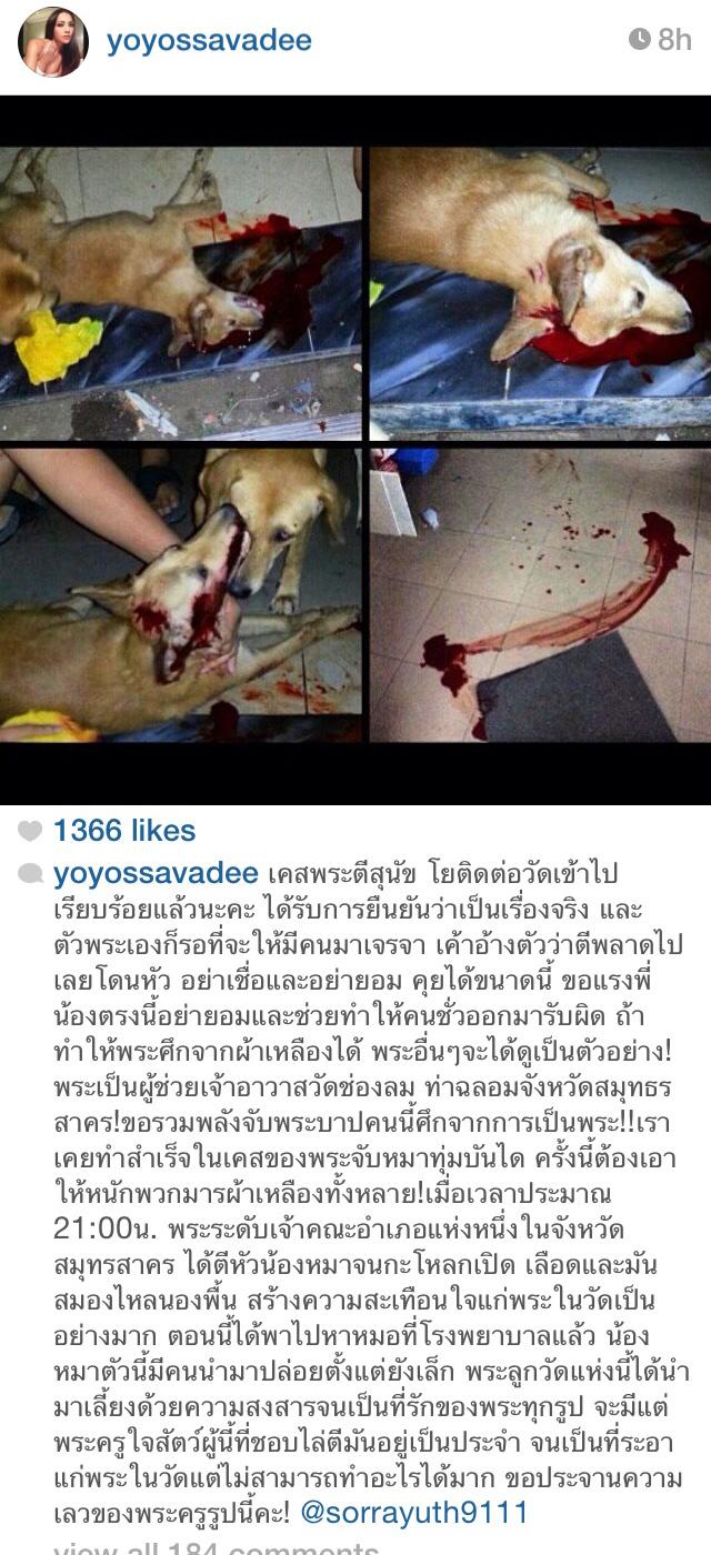 ตามรายงานระบุว่า เมื่อวานนี้ (31 มี.ค.) ในอินสตาแกรมของนางแบบสาว โย ยศวดี หนึ่งในผู้รณรงค์กลุ่มพิทักษ์ปกป้องและงดทานเนื้อสุนัขได้โพสต์ภาพอาการบาดเจ็บของสุนัขตัวหนึ่ง ซึ่งมีผู้ประสงค์ดีได้ส่งภาพเหตุการณ์ที่เกิดขึ้นมาให้ตรวจสอบ ซึ่งทางด้านนางแบบสาวได้ตรวจสอบและพบว่าเป็นกรณีที่เกิดขึ้นจริง อีกทั้งเป็นเหตุที่ขึ้นภายในวัดชื่อดังแห่งหนึ่ง โดยมีกระทำต่อสัตว์คือพระผู้ช่วยเจ้าอาวาส