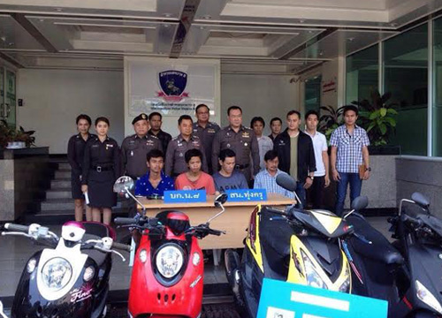 พล.ต.ต.ไอยศูรย์ สิงหนาท รักษาราชการแทน ผบก.น.8 พร้อม เจ้าหน้าที่ตำรวจ จาก สน.ทุ่งครุ ร่วมกันแถลงข่าวจับกุมแก๊งโจรกรรมรถ จยย. รายใหญ่ในพื้นที่ฝั่งธนบุรี ได้ผู้ต้องหา จำนวน 5 ราย ประกอบด้วย 1. นายเอ (นามสมมุติ) อายุ 17 ปี 2. นายคมศักดิ์ หรือ เต๋า โชคเสริมวิทย์ อายุ 24 ปี 3. นายธีรพล หรือ เบิร์ด ไม้จันทร์ อายุ 19 ปี 4. นายวิจิตต์ หรือ ตือ ผจงกิจการ อายุ 31 ปี และ 5. นายชูชาติ หรือ ต้น วงศ์รักกิจ อายุ 52 ปี พร้อมของกลาง รถจักรยานยนต์ 5 คัน สามารถจับกุมได้ที่บริเวณหน้าตึกเช่าไม่มีเลขที่ ตรงข้ามปั๊มแก๊ส ถนนประชาอุทิศ แขวงและเขตทุ่งครุ