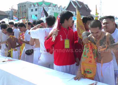 พิธีอัญเชิญเทพเจ้าประทับทรงเทศกาลกินเจ ร่างทรงกว่า 80 ร่าง แสดงอิทธิฤทธิ์ใช้สิ่งของมีคมทิ่มแทงร่างกาย