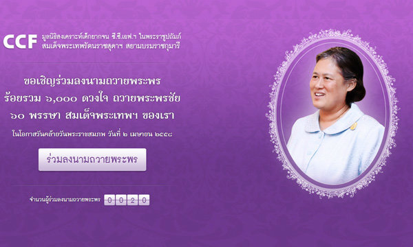 เนื่องในวโรกาสมงคลที่สมเด็จพระเทพพระรัตนราชสุดาฯ สยามบรมราชกุมารี จะทรงเจริญพระชนมพรรษา 60 พรรษาในวันที่ 2 เมษายน 2558 ที่จะถึงนี้ ทางมูลนิธิสงเคราะห์เด็กยากจน C.C.F. ในพระราชูปถัมภ์ สมเด็จพระเทพรัตนราชสุดาฯ ได้เปิดอีกหนึ่งช่องทางให้พสกนิกรได้แสดงความจงรักภักดีด้วยการร่วมลงนามถวายพระพรออนไลน์