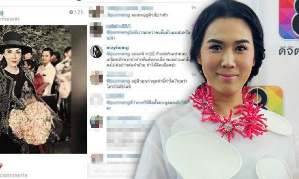 ถามถึงคอมเม้นท์ในไอจีที่ต่อว่า "เมย์" ค่อนข้างรุนแรง โดยคุณแม่ยังสาวเผยว่า "คนนี้ลงรูปครั้งแรก ตอนกลางคืนก็มีคำหยาบมา 1 คำ เราก็ไม่ได้ว่าอะไรก็เฉยๆ คิดว่าเป็นโรคจิตมั้งก็เลยปล่อยไป ช่วงนี้เมย์นอนดึกตื่นเช้าเพราะต้องให้นมลูกและปั๊มนมด้วย พอตอนเช้าตื่นมาดูรูปอีก อุ้ย!คราวนี้มา 2 พยางค์แรงๆ เราก็ปรี๊ดเหมือนกัน เลยตอบกลับซะเลย หลังจากนั้นแฟนๆและคนที่ติดตามเมย์ตามไอจีก็ทนไม่ไหวเหมือนกันเขาก็ช่วยโต้ตอบกลับไป จริงๆกับคนๆนี้เราไม่ตอบก็ได้แต่มันหลายทีอ่ะ ก็สักหน่อยแล้วกัน แล้วก็บล็อกเขาไปเลย จริงๆอยากจะสืบด้วยว่าเป็นใคร มาจากไหน เบื่อมากคนหลบหน้ามาว่าคนอื่น มันโรคจิต แล้วเขาไปว่าดาราหลายคนด้วยนะ อยากจะบอกคนพวกนี้ด้วยนะว่าระวังนะสักวันนึงเขาสืบได้จะออกมาแฉให้เห็นเลยว่าหน้าที่คุณว่าคนอื่น จริงๆแล้วหน้าคุณเป็นแบบนี้"