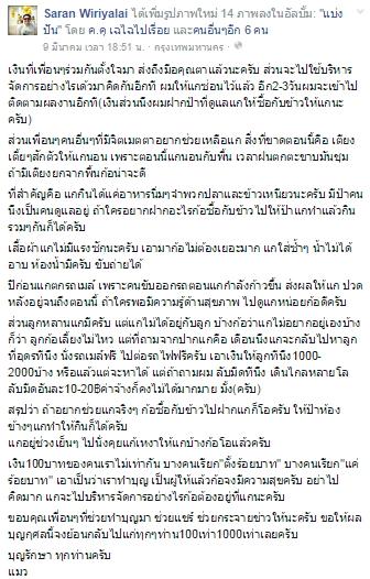 "เงินที่เพื่อนๆ ร่วมกันตั้งใจ มาส่งถึงมือคุณตาแล้วนะครับ ส่วนจะไปใช้บริหารจัดการอย่างไรเดี๋ยวมาคิดกันอีกที ผมให้แกซ่อนไว้แล้ว อีก 2-3 วัน ผมจะเข้าไปติดตามผลงานอีกที (เงินส่วนนึงผมฝากป้าที่ดูแลแกให้ซื้อกับข้าวให้แกนะครับ)