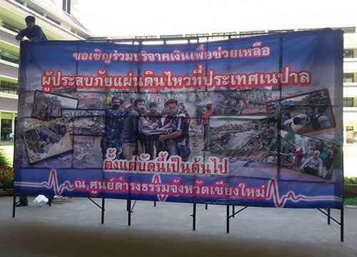 ที่ บริเวณหน้าศูนย์ดำธงธรรม ศาลากลางจังหวัดเชียงใหม่ เจ้าหน้าที่ได้ติดตั้งป้ายไวนิล แจ้งประชาชนเพื่อรับบริจาคเงินช่วยเหลือชาวเนปาลที่ประสบเหตุแผ่นดินไหวครั้งใหญ่ที่รุนแรงที่สุดในรอบ 81 ปี ส่งผลให้อาคารบ้านเรือนในบริเวณดังกล่าวและเมืองใกล้เคียง พังถล่มเสียหายและมีผู้เสียชีวิตแล้วกว่า 3,000 คน ขณะที่นานาชาติก็เริ่มทยอยให้การช่วยเหลือผ่านกาชาดสากล