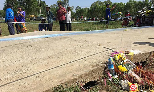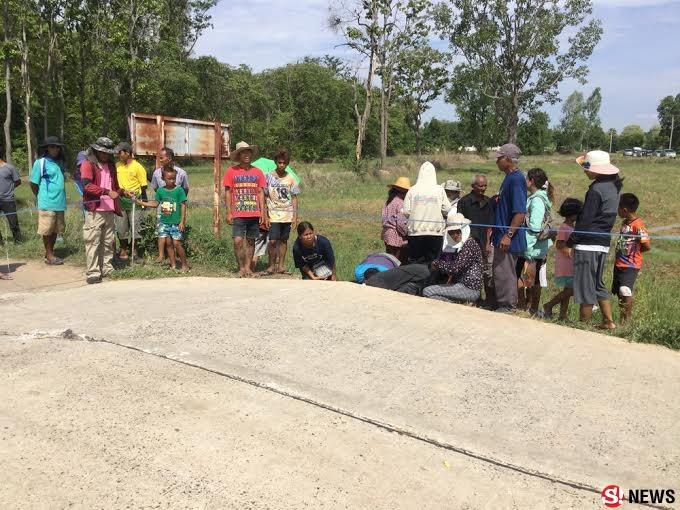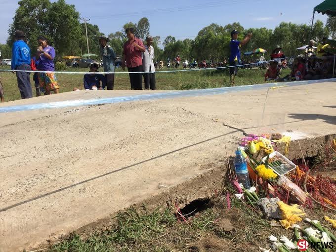 ผู้สื่อข่าวรายงานว่า (14 พ.ค.) เมื่อเวลา 09.00 น. ที่บริเวณถนนคอนกรีต ระหว่างบ้านนาเกากับบ้านบึง ต.แกใหญ่ อ.เมือง จ.สุรินทร์ ชาวบ้าน 2 หมู่บ้าน ได้ประกอบพิธีเซ่นไหว้เจ้าที่ หลังจากชาวบ้านพบว่าช่วงปลายของถนนคอนกรีต มีการยกตัวสูงขึ้นจากพื้นดินประมาณ 10 นิ้ว โค้งนูนขึ้นคล้ายหลังเต่าจนเกิดเป็นโพรงด้านล่าง มีรอยแตกตามผิวคอนกรีต โดยชาวบ้านที่ทราบข่าวต่างเดินทางมาดู โดยนำดอกไม้ธูปเทียน มาเซ่นไหว้ตามความเชื่อ