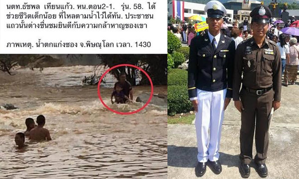 จากกรณีเฟซบุ๊ก Pre-Cadet ได้โพสต์ภาพและข้อความว่า "วันก่อน นตท.ธัชพล เทียนแก้ว นตท.รุ่นที่ 58 ชั้น 2-1 และเป็น หน.ตอน ด้วย ได้สร้างวีรกรรมด้วยการช่วยชีวิตเด็ก ที่น้ำตกแก่งซอง จ.พิษณุโลก ขอแสดงความชื่นชมในการกระทำความดีในครั้งนี้ด้วยนะครับ" ซึ่งข้อความดังกล่าวถูกแชร์ไปพร้อมการแสดงความชื่นชมนั้น