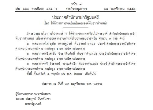 เว็บไซต์ราชกิจจานุเบกษา เผยแพร่ ประกาศสํานักนายกรัฐมนตรี เรื่อง ให้ข้าราชการพลเรือนในพระองค์พ้นจากตําแหน่ง ความว่า มีพระบรมราชโองการโปรดเกล้า ฯ ให้ข้าราชการพลเรือนในพระองค์ สังกัดสํานักพระราชวัง พ้นจากตําแหน่ง เนื่องจากลาออกจากราชการ เพื่อไปประกอบอาชีพอื่น จํานวน 3 ราย ดังนี้