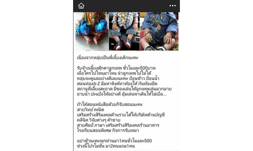 ธุรกิจใหม่! เปิดเนอร์สเซอรี่รับดูแล “ตุ๊กตาลูกเทพ”ธุรกิจใหม่เอาใจผู้เลี้ยงลูกเทพ คือ รับจ้างเลี้ยงตุ๊กตาลูกเทพ ดูแลป้อนข้าวป้อนน้ำ แถมเสริมการสอนหนังสือทุกวิชา รวมถึงสอนสวดมนต์