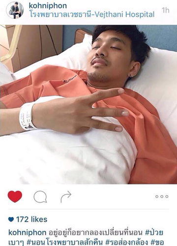 ทั้งนี้ หนุ่มโก๊ะ ได้โพสต์ไอจีส่วนตัว kohniphon พร้อมเขียนข้อความว่า "อยู่ๆ ก็อยากลองเปลี่ยนที่นอน ป่วยเบาๆ นอน รพ. สักคืน รอส่องกล้อง" โดยมีแฟนคลับเข้ามาโพสต์ให้กำลังใจขอให้ป่วยไวๆ เป็นจำนวนมาก