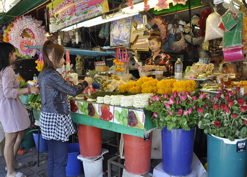 ด้าน นายเจษฎา รอดสุวรรณ พ่อค้าขายดอกไม้สด ภายในตลาดแม่กิมเฮง เปิดเผยว่า ตั้งแต่ช่วงเช้าที่ผ่านมา มีประชาชนเดินทางมาเลือกซื้อดอกไม้เพื่อเตรียมนำไปเวียนเทียนกันเป็นจำนวนมาก แต่เนื่องจากในปีนี้มีระสบปัญหาภัยแล้ง สภาพอากาศที่แปรปรวน อีกทั้งยังมีพายุ จึงทำให้ดอกไม้ที่ออกสู่ท้องตลาดมีไม่มาก อีกทั้งสภาพดอกก็จะไม่สมบูรณ์เหมือนทุกๆ ปี จึงเป็นสาเหตุที่ทำให้ราคาดอกไม้มีการปรับราคาที่สูงขึ้น ซึ่งเดิมดอกบัวขนาดเล็กเคยรับมาจำหน่ายในราคาดอกละ 2 บาทถึง 50 สตางค์ ขึ้นเป็น 3 บาท ถึง 3 บาท 50 สตางค์ ทำให้ทางร้านต้องจำหน่ายอยู่ที่ดอกละ 5 – 7 บาท ดอกดาวเรืองดอกใหญ่ เดิมดอกละ 1 บาท 50 สตางค์ ขึ้นเป็น ดอกละ 2 บาท ถึง 3 บาท หรือ จากเดิม 1 ถุง มี 100 ดอก จำหน่าย ถุงละ 250 บาท เป็น 280 – 320 บาท และดอกกล้วยไม้ จากเดิม กิโลกรัม ละ 100 บาท เป็นกิโลกรัมละ 130 – 140 บาท
