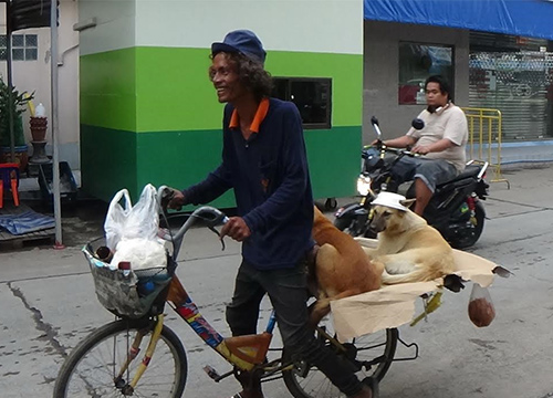 คนจรจัด นำสุนัขไทยพันทางเร่ร่อน เพศเมีย 2 ตัว มาเลี้ยง พร้อมพาปั่นจักรยานรอบเมืองอ่างทอง เรียกรอยยิ้มให้ผู้พบเห็น