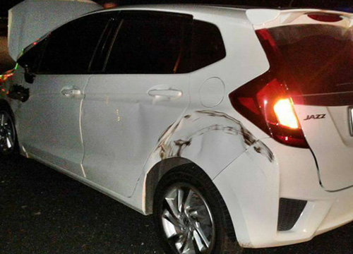 เก๋งเสียหลักชนที่กั้นทางและรถบัสโดยสาร
