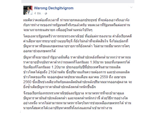 นพ.วรงค์ เดชกิจวิกรม อดีต ส.ส.พรรคประชาธิปัตย์ โพสต์ข้อความความผ่านเฟซบุ๊กส่วนตัว "Warong Dechgitvigrom" ว่า ถึงเวลาที่ พล.อ.ประยุทธ์ จันทร์โอชา นายกรัฐมนตรี ต้องเอาจริงเอาจังกับการทำงานของคณะรัฐมนตรีแล้ว โดยเฉพาะรัฐมนตรีว่าการกระทรวงพาณิชย์ ที่แม้แต่การลงนาม คำสั่งเรียกคดีค่าเสียหายการระบายข้าวแบบจีทูจี ก็ยังไม่กล้าตัดสินใจ จึงไม่แปลกที่ปัญหาราคาพืชผลเกษตรยังตกต่ำ ไม่สามารถมีมาตรการใด ๆ ออกมาช่วยเกษตรกรได้ปัญหาที่จะมารุมเร้ารัฐบาล คือ ราคามันสำปะหลังที่ตกต่ำมากกว่าราคาทุน ประกอบกับปีนี้ประเทศจีน สามารถผลิตข้าวโพดได้สูงถึง 210 ล้านตัน ซึ่งปริมาณเกินความต้องการและช่วงผลผลิตข้าวโพดของจีนจะออกสู่ตลาดประมาณเดือน ต.ค. 59 ถึง เม.ย. 60 ซึ่งเป็นช่วงเดียวกันกับผลผลิตมันสำปะหลังปริมาณมากออกสู่ตลาด ราคามันสำปะหลังตกต่ำหนักขึ้นอีก