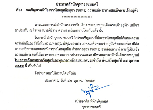 นายอาศิส พิทักษ์คุมพล จุฬาราชมนตรี ได้ออกประกาศสำนักจุฬาราชมนตรี ขอเชิญชวนพี่น้องชาวไทยมุสลิม ได้ร่วมกันแสดงความจงรักภักดีและสำนึกในพระมหากรุณาธิคุณ ของพระบาทสมเด็จพระเจ้าอยู่หัว ด้วยการดุอาอ์ (ขอพร) จากอัลเลาะห์ พระผู้เป็นเจ้า ถวายแด่พระองค์ให้ทรงหายจากพระอาการประชวร และทรงมีพระพลานามัยที่แข็งแรงสมบูรณ์ ในเวลาหลังละหมาดวันศุกร์ และทุกเวลาหลังละหมาดประจำวัน ตั้งแต่วันศุกร์ที่ 14 ตุลาคม 2559 เป็นต้นไป