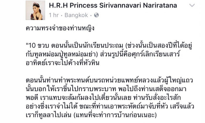 โดยเมื่อวันที่ 15 ตุลาคม 2559 เฟชบุ๊คเพจ H.R.H Princess Sirivannavari Nariratana โพสต์ข้อความ ความทรงจำของท่านหญิง