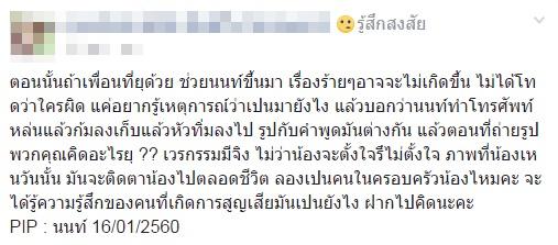 พร้อมกับระบุว่า ผู้เสียชีวิตคือ นายกิตติพงษ์ หรือ นนท์ และตั้งข้อสังเกตว่าหากคนที่อยู่ในเหตุการณ์คิดจะช่วยจริง ๆ ก็น่าจะช่วยทัน และเวรกรรมมีจริง ไม่ว่าจะตั้งใจหรือไม่ แต่ภาพดังกล่าวจะติดตาคนอยู่ในเหตุการณ์ไปตลอด และอยากให้คิดถึงจิตใจของคนในครอบครัวที่ต้องเจอกับความสูญเสีย