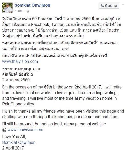 "ในวันเกิดครบรอบ 69 ปี ของผม วันที่ 2 เมษายน 2560 นี้ ผมจะขอยุติการสื่อสารสังคมผ่าน Facebook, Twitter, และเครือข่ายสังคมอื่น เพื่อใช้ชีวิตปลายทางอย่างสงบ ไปกับการอ่าน เขียน และเดินทางท่องเที่ยว โดยส่วนใหญ่จะอยู่บ้านพัก ที่ภูพิมาน ปากช่อง นครราชสีมา
