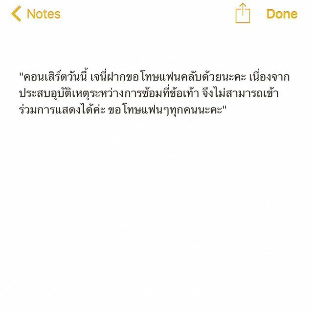 "อีกหนึ่งคนสำคัญที่ขาดไม่ได้สำหรับคอนเสิร์ตนี้ เจนี่ นางแข็งแกร่งมาก ซ้อมกันอย่างหนักจนถึงวันสุดท้าย เกิดอุบัติเหตุพลาดในวันซ้อมใหญ่ เสียดายมากจริงๆที่ทุกคนไม่ได้เห็นโชว์สุดพิเศษของเจน ขอบคุณมากนะคะเจนที่ทุ่มเทเพื่อคอนเสิร์ตของพวกเรา หายไวๆน้าาา"