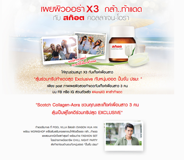 สก๊อต คอลลาเจน-โอร่า ชวนคุณและแก๊งเพื่อนสาว 3 คน ลุ้นเป็นผู้โชคดีร่วมทริปสุด Exclusive ท้าแดดริมทะเล ! เพียงแค่ชวนเพื่อน ๆ ออกมาลั้ลลาถ่ายรูปเผยผิวออร่ากันแบบ X3 ท้าทายแสงแดด ไม่แน่ ! คุณอาจจะได้เป็นผู้โชคดีได้ลุ้นเที่ยวทริปสุด Exclusive ยกแก๊งฟรีกับหนุ่มสุดฮอต ! "ปั้นจั่น ปรมะ" ที่ Pool Villa รีสอร์ท Evason Hua Hin พร้อม Workshop เคล็ดลับเสริมคอลลาเจนให้ผิวแข็งแรง กล้า... ท้าแดด และเรียนรู้เทคนิคโพสท่าสุดเก๋ พร้อมถ่าย Fashion Set โดยช่างภาพมืออาชีพ ปิดท้ายด้วยไฮไลท์ Chill Night Party ส่งท้ายคุณและแก๊งเพื่อนสาวก่อนเข้านอนกับ "ปั้นจั่น ปรมะ" บอกเลยงานนี้ฟินยิ่งกว่าฟิน !