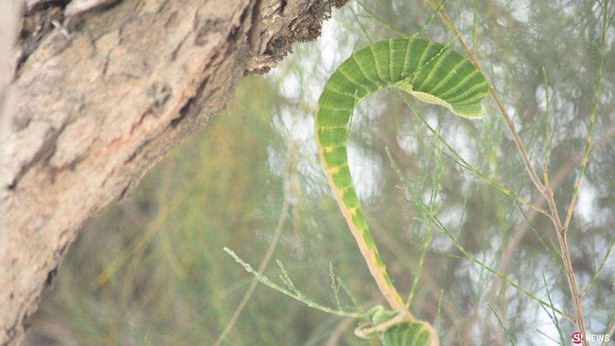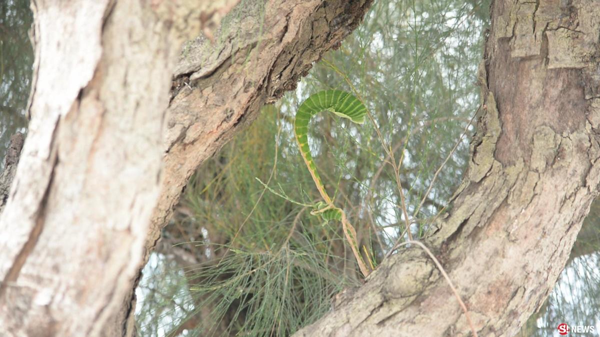 ในขณะที่กำลังจะเอื้อมเพื่อพันรอบต้นได้เหลือบขึ้นไปเห็นที่บนยอดต้นสน เส้นคล้ายกับตั๊กแตนตำข้าวหรือตั๊กแตนต่อยมวย ตัวเขียวอำไพคล้ายมรกต เพราะช่วงเวลานั้นมีแต่แสงไฟของร้านค้าขายในตลาด คงจะไปกระทบกับใบสนทำให้เห็นได้เด่นชัด ลักษณะกำลังกำหมัดจะต่อยมวย