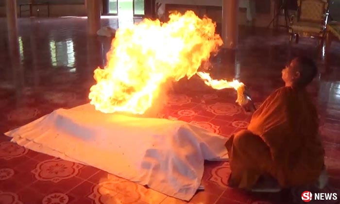 ล่าสุด วันนี้ (10 ต.ค.) ผู้สื่อข่าวจึงลงพื้นที่เดินทางไปยังวัดป่ารัตนสุทธิกระทม เพื่อสอบถามข้อเท็จจริงที่เกิดขึ้น และได้พบกับพระปลัดรัตนชัย อสิงสโก เจ้าอาวาสวัดป่ารัตนสุทธิกระทม อายุ 44 ปี ที่ศาลาการเปรียญภายในวัด ก่อนจะทำการสาธิตการพ่นลูกไฟให้ผู้สื่อข่าวดู