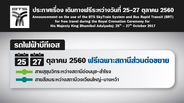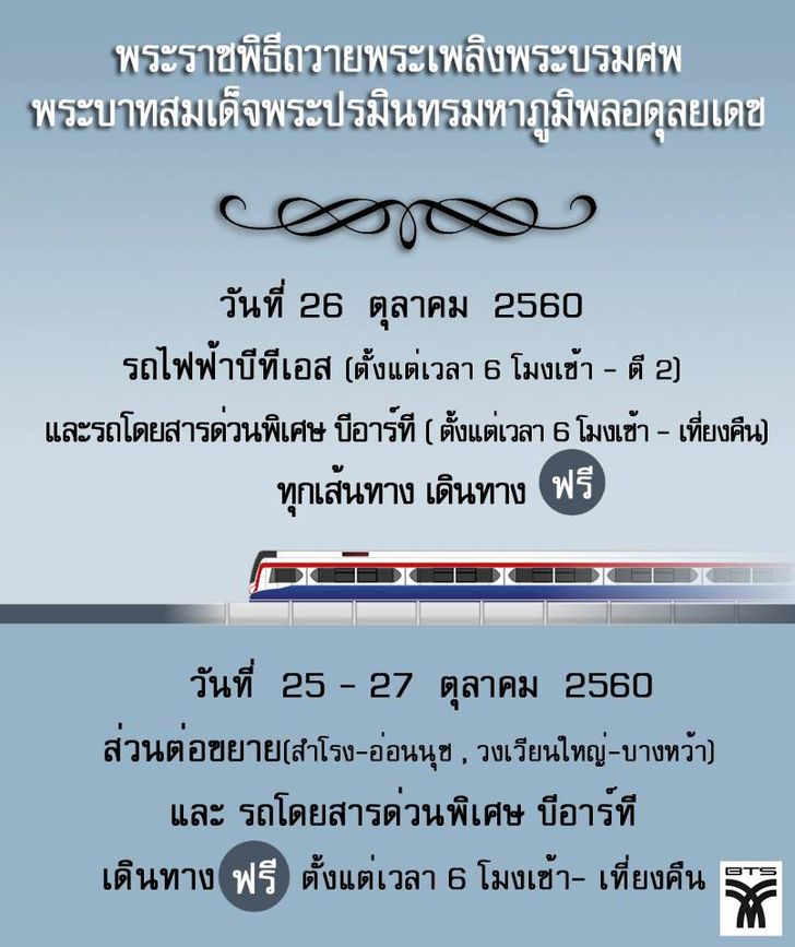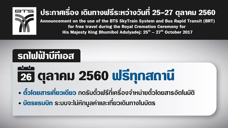 *** คืนวันที่ 26 ตุลาคม เปิดบริการฟรีถึง 02.00 น. ของวันที่ 27 ตุลาคม 2560