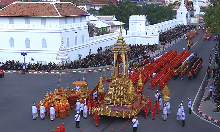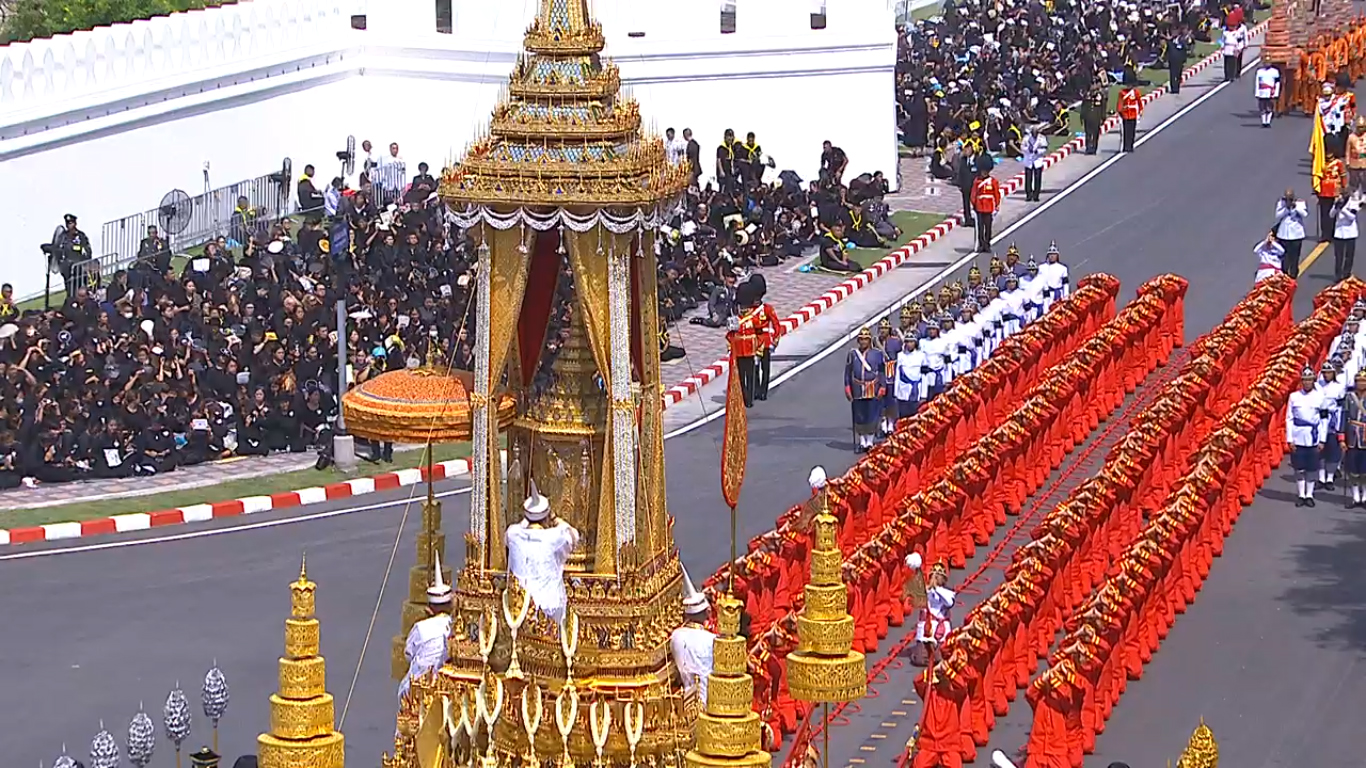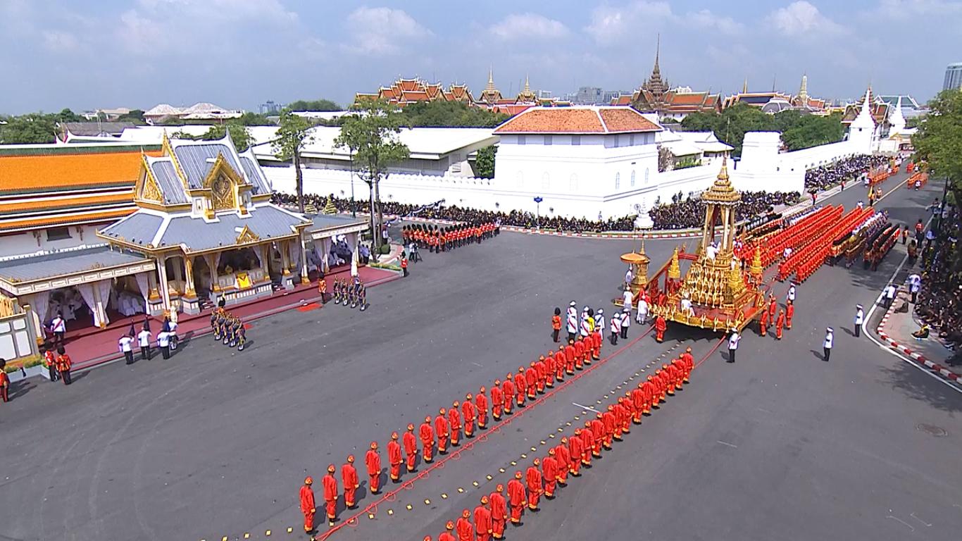 ยาตราขบวนแห่อัญเชิญพระบรมโกศไปยังพระเมรุมาศ โดยริ้วขบวนจะเคลื่อนไปทางถนนสนามไชย ตรงเข้าสู่ถนนราชดำเนินในมณฑลพิธีท้องสนามหลวง สมเด็จพระเจ้าอยู่หัวฯ สมเด็จพระเทพรัตนราชสุดาฯ ทรงพระดำเนินตาม