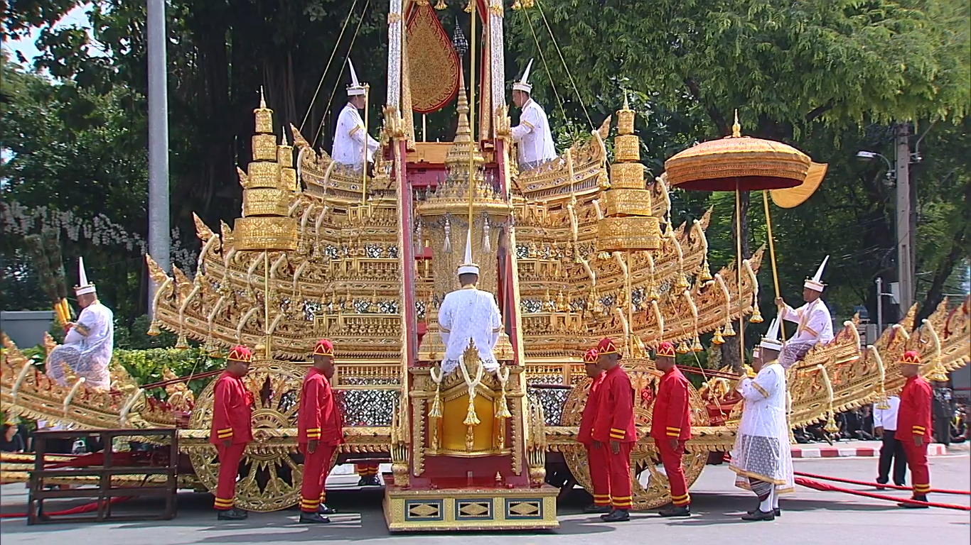 เจ้าพนักงานภูษามาลาอัญเชิญพระโกศทองใหญ่โดยเกรินบันไดนาค ขึ้นประดิษฐานในบุษบก พระมหาพิชัยราชรถ