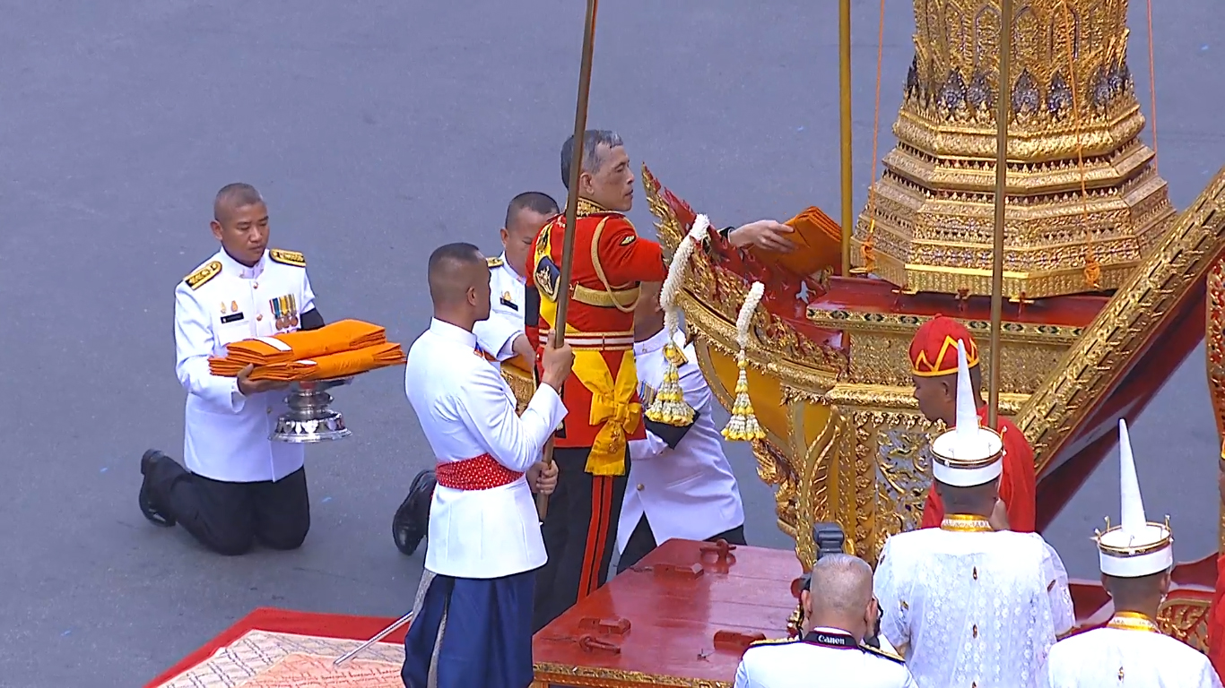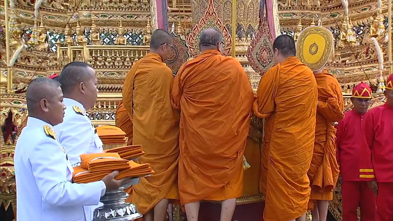 เวลา 10.05 น. เมื่อขบวนพระบรมราชอิสริยยศถึงยังพระมหาพิชัยราชรถ หน้าวัดพระเชตุพนวิมลมังคลาราม สมเด็จพระเจ้าอยู่หัวมหาวชิราลงกรณ บดินทรเทพยวรางกูร เสด็จฯไปยังพลับพลายกหน้าวัดพระเชตุพนวิมลมังคลาราม ทรงทอดผ้าไตร 20 ไตร ที่ท้ายเกรินบันไดนาคพระมหาพิชัยราชรถ พระสงฆ์สดับปกรณ์เที่ยวละ 5 รูป