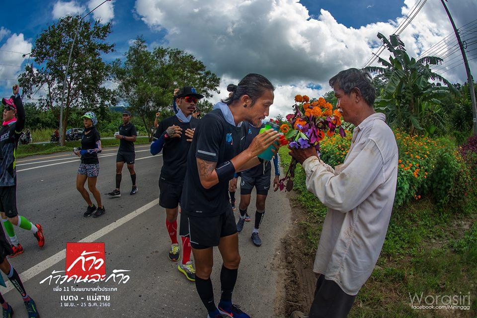 จังหวะที่พี่ตูนกับทีมงานวิ่งมาถึง จึงได้ตะโกนเรียกพี่ตูน ว่ามีลุงรอมอบช่อดอกไม้อยู่โชคดีมาก ที่พี่ตูน ก้าวเท้ามารับด้วยตัวเอง วินาทีนั้น รวดเร็วมาก ดอกไม้ถูกส่งมืออย่างรวดเร็ว เรียบง่าย สิ้นสุดความตั้งใจของลุง จบลงด้วยรอยยิ้ม สุดท้ายแล้ว ดอกไม้ช่อนั้นก็ขอให้ยังคงเบิกบานในหัวใจของทุกคน ที่อยากจะเห็นพี่ตูน วิ่งไปจนถึงจุดหมายที่ตั้งใจไว้"