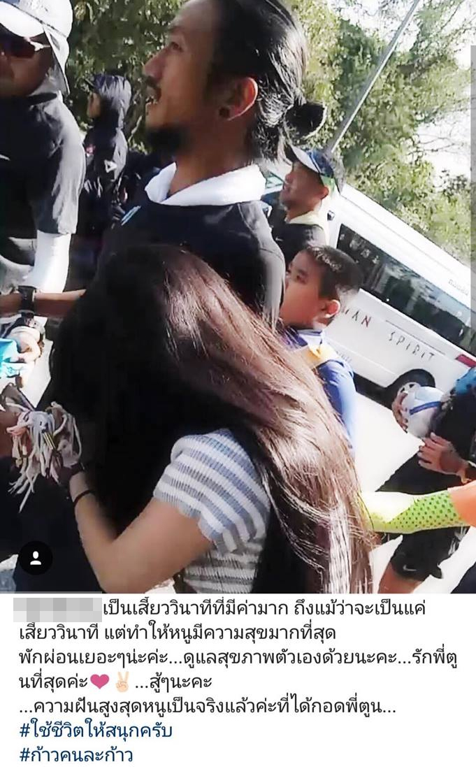 "เป็นเสี้ยววินาทีที่มีค่ามาก ถึงแม้ว่าจะเป็นแค่เสี้ยววินาที แต่ทำให้หนูมีความสุขมากที่สุด พักผ่อนเยอะๆ นะคะ...ดูแลสุขภาพตัวเองด้วยนะคะ...รักพี่ตูนที่สุดค่ะ...สู้ๆนะคะ…ความฝันสูงสุดหนูเป็นจริงแล้วค่ะที่ได้กอดพี่ตูน... #ใช้ชีวิตให้สนุกนะครับ #ก้าวคนละก้าว"