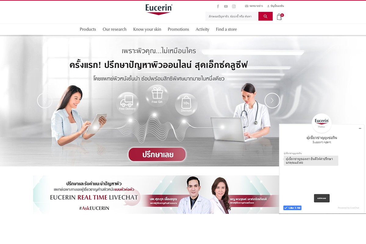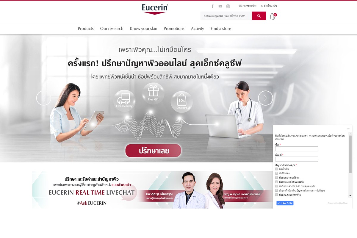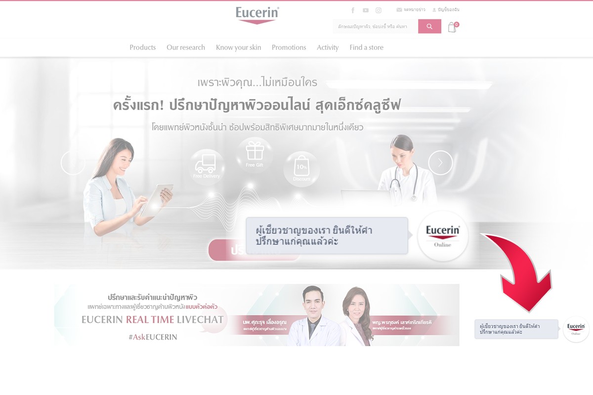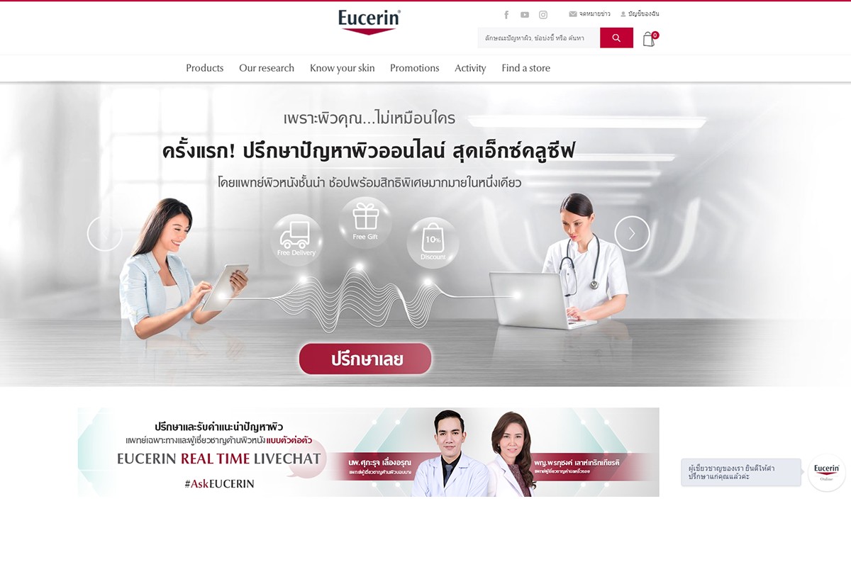 นี่จึงเป็น ครั้งแรกของประเทศไทย กับการปรึกษาผู้เชี่ยวชาญด้านผิวพรรณแบบออนไลน์ในธุรกิจ E-Commerce เพราะยูเซอรินเข้าใจถึงความต้องการของผู้บริโภค จึงเปิดโอกาสให้เราได้ติดต่อสื่อสารและปรึกษาปัญหาผิวแบบ Real time กับแพทย์ผิวหนัง เภสัชกร หรือผู้เชี่ยวชาญด้านผิวพรรณได้อย่างสะดวกรวดเร็ว ในแบบที่ไม่เคยมีมาก่อน www.eucerin.co.th จึงเป็นเว็บไซต์ E-Commerce เว็บแรกของเมืองไทยที่ไม่ได้มีไว้จำหน่ายสินค้าเพียงอย่างเดียวอีกต่อไป