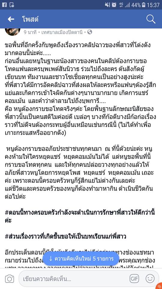 โดยน้องสาวของหญิงสาวคนดังกล่าว ได้กราบขออภัยแฟนละคร และทีมงานผู้ผลิตละคร ถึงเรื่องดังกล่าว พร้อมขอร้องให้หยุดแชร์คลิปของพี่สาว โดยตอนนี้ทางครอบครัวกำลังดำเนินการรักษาพี่สาวให้ดีกว่านี้