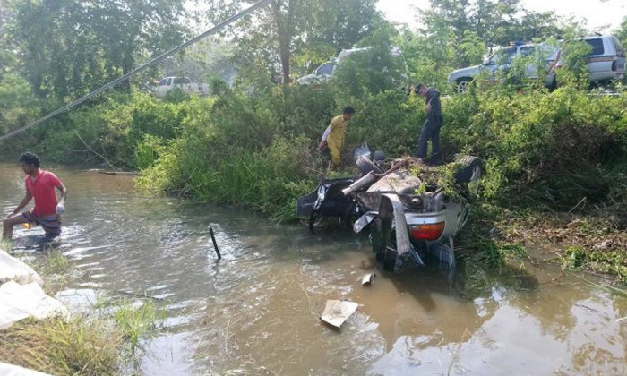 ปิกอัพซิ่งชนท้ายเก๋งกระเด็นตกคลอง สภาพพังยับ คนติดในรถดับ 3 ศพ