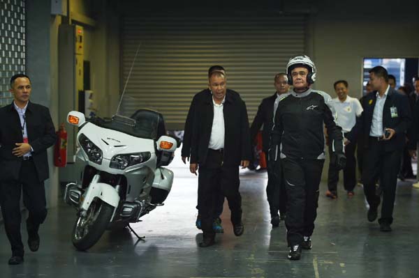 เมื่อนายกรัฐมนตรี เดินทางถึงได้เยี่ยมชมนิทรรศการเกี่ยวกับรถจักรยานยนต์และการแข่งขันของสนามต่างๆ รวมทั้งให้กำลังใจกับผู้สนับสนุนและเยาวชนผู้ที่เข้าร่วมแข่งขันและผู้ฝึกหัด จากนั้นนายกรัฐมนตรี ได้เปลี่ยนสวมชุดเซฟตี้สำหรับการขับขี่รถจักรยานยนต์ หรือชุดนักแข่งรถมอร์เตอร์ไซด์ และได้เลือกขับขี่รถ Yamaha MT-09 Tracer ขนาด 900 CC รถแข่งแนวอเนกประสงค์ตัวแรง ประเภททัวร์ริ่ง ป้ายด้านหลังเขียนว่า GU 12 BURIRAM UNITED 1 ส่วนนายเนวิน ชิดชอบ ขับขี่ Honda CB 1100 ทะเบียน 7กฌ 6922 โดยขับขี่จำนวน 2 รอบสนาม และได้ลงมาขอบคุณเจ้าหน้าที่และผู้เกี่ยวข้องทุกคน