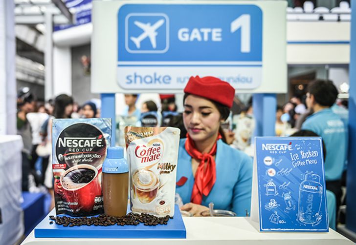 เริ่มต้นจาก Shake-In counter โซนเช็คอินที่มีเชคโฮสเตสสาวสวยคอยให้การต้อนรับ ชวนให้เข้าไปสัมผัส ประสบการณ์การเชคความสดชื่นของ NESCAFÉ RED CUP โดยผู้ที่มาร่วมเชคความสนุกจะได้รับบัตร Boarding Pass คนละใบเพื่อเข้ารับการ Shake In ในโซนเคาน์เตอร์แจก NESCAFÉ Shaker หรือกระบอกเชค NESCAFÉ ดีไซน์ใหม่ มาพร้อมฟังก์ชั่นการใช้งานที่ง่ายขึ้น สะดวกขึ้น จับถนัดมือมากขึ้น เป็นตัวช่วยเชค ความอร่อยให้กาแฟเย็นได้มาก อีกทั้งยังได้รับการดีไซน์กระบอกเชคที่เขียนชื่อในแบบของตัวเอง มีเพียง กระบอกเดียวในโลกอีกด้วย ตอกยํ้าการดื่มกาแฟในรูปแบบของ Personalization เพื่อให้ได้รสชาติที่ใช่จากการปรับสูตรกาแฟได้ด้วยตนเองและ งานดีไซน์แพ็คเกจจิ้งที่ไม่เหมือนใคร มีไว้สําหรับเป็นคอลเล็คชั่นสําหรับตัวเองโดยเฉพาะ